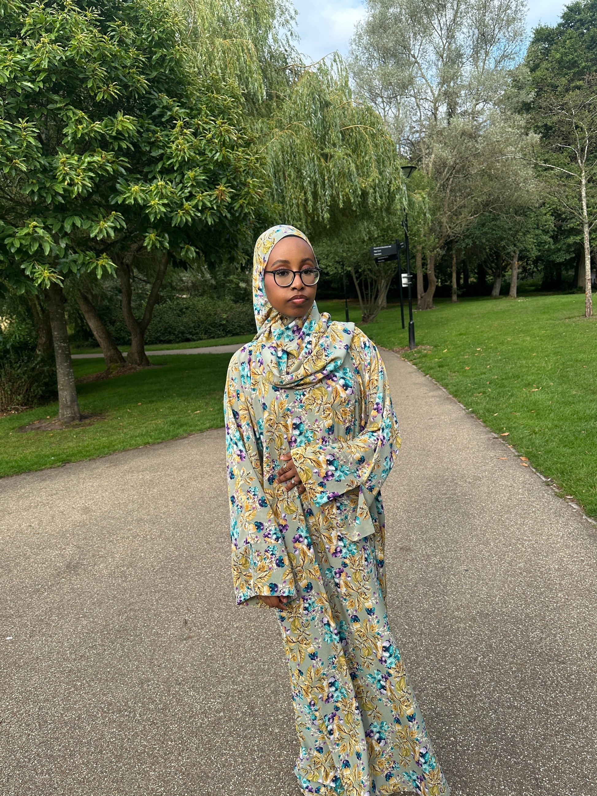 This multicolour abaya, paired with a matching hijab, is crafted from breathable, lightweight fabric to ensure comfort throughout the day. Its vibrant design offers a stylish yet practical choice for those seeking both elegance and ease in their attire. Ideal for warm climates, the material promotes airflow while maintaining modesty and grace.