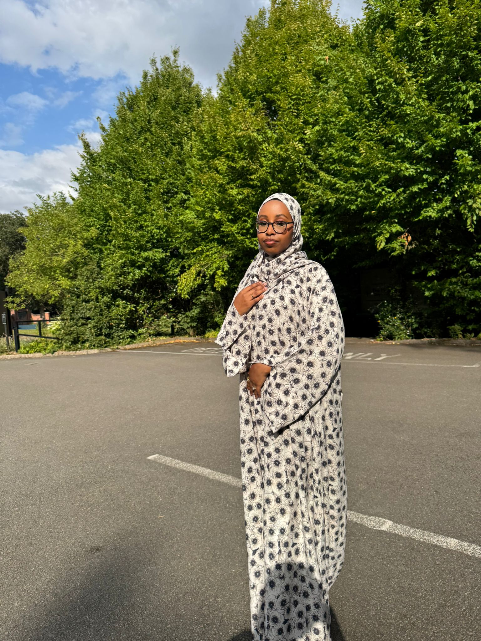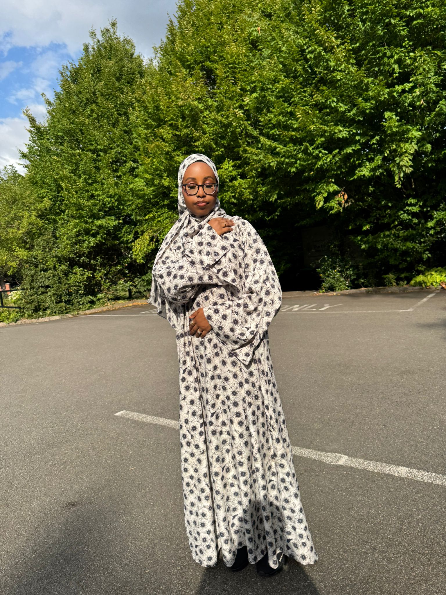 This lightweight abaya, adorned with subtle navy floral accents, comes with a matching hijab to complete the ensemble. Crafted for everyday comfort and ease, it combines practicality with a sophisticated aesthetic, making it a versatile addition to your wardrobe.